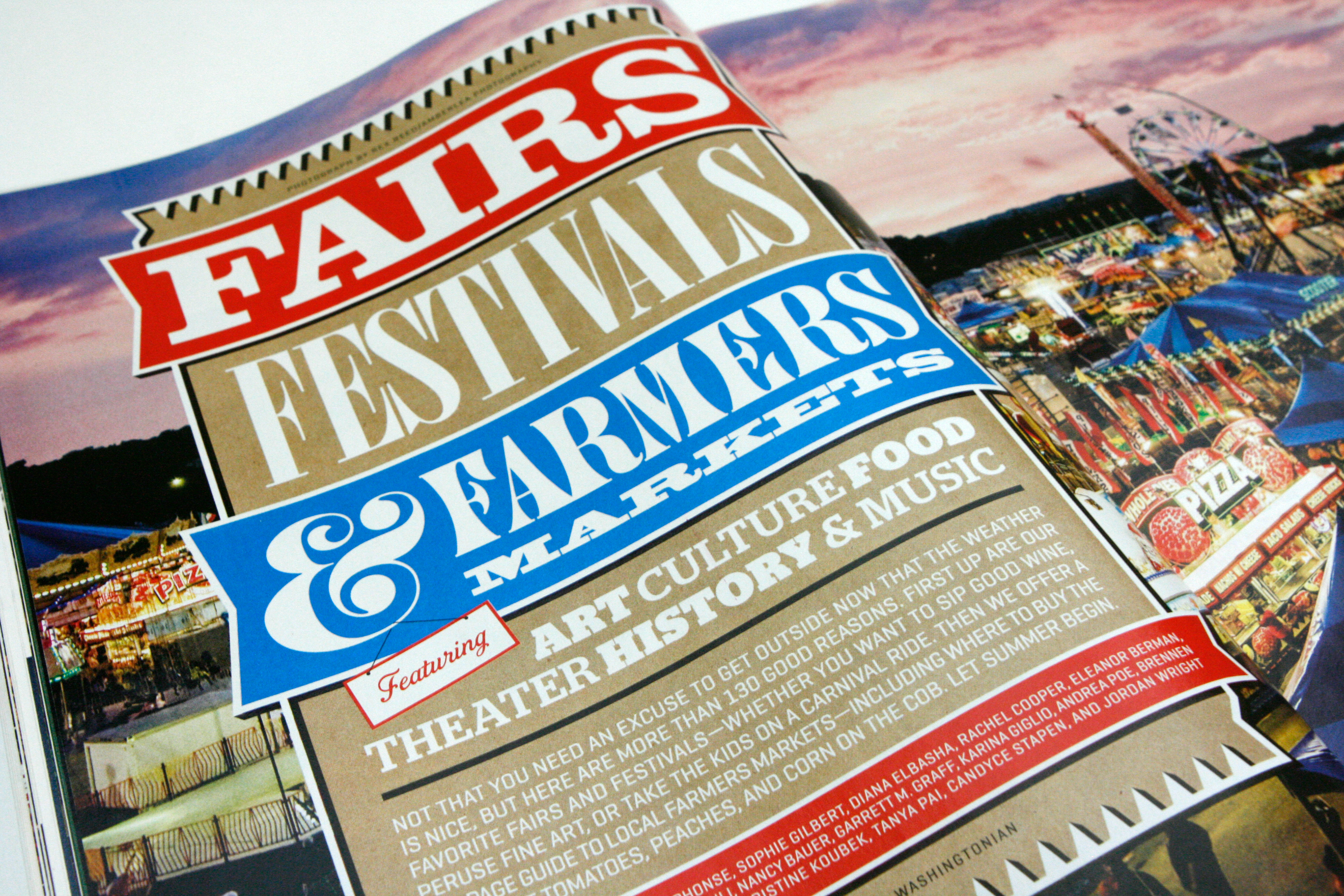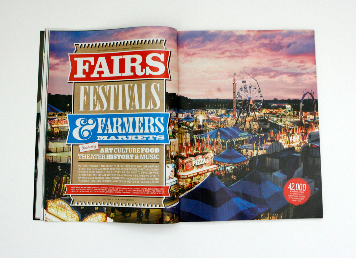 Feature opener for Fairs, Festivals, & Farmers Markets in Washingtonian's May 2013 issue. Creative Director Michael Goesele Designers Tom White, Christine Santana